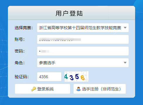 返回登录页面,根据注册时所填信息登录已注册账号,用户名为身份证号码,密码为注册时自行设置的密码。登陆成功进入参赛系统。(如图1-4、1-5)