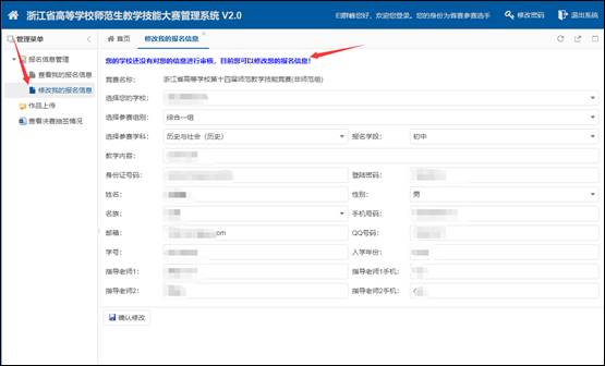 单击系统左侧功能菜单下的“报名信息管理”,可以查看报名信息,若处于未审核状态,可以点击“修改我的报名信息”进行修改;若已审核通过,则无法修改。(如图2-1、2-2)。